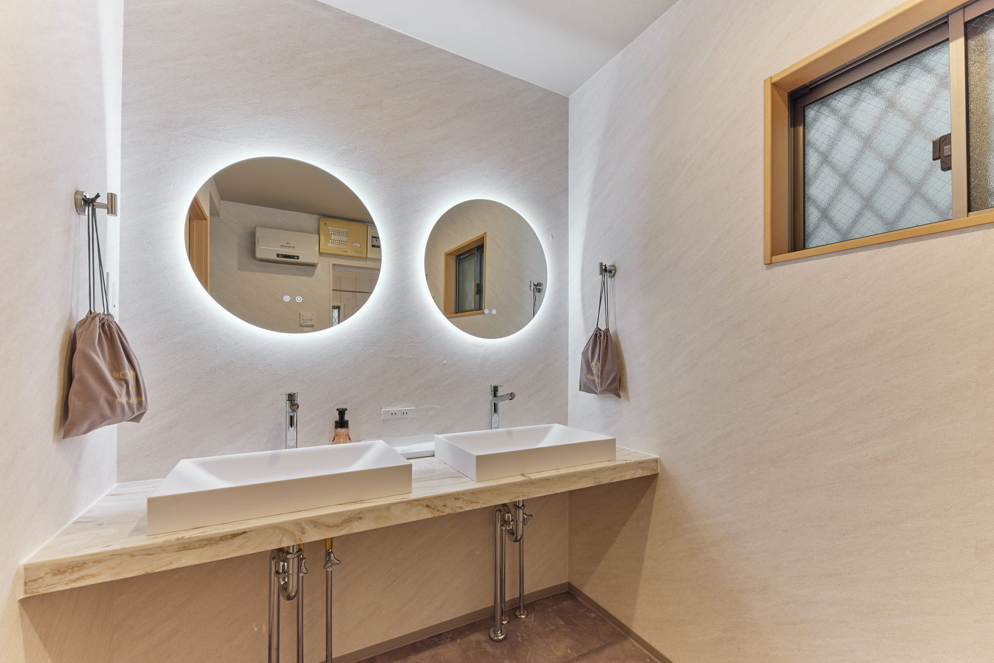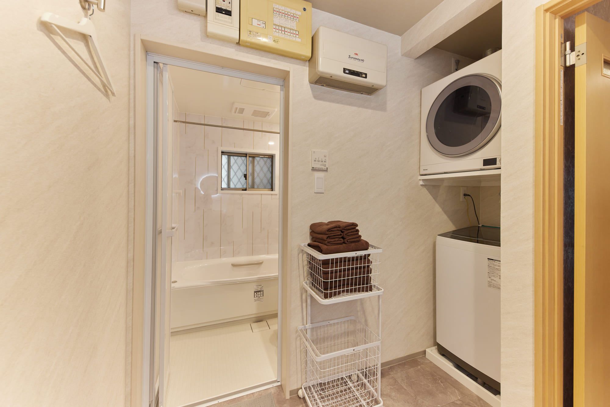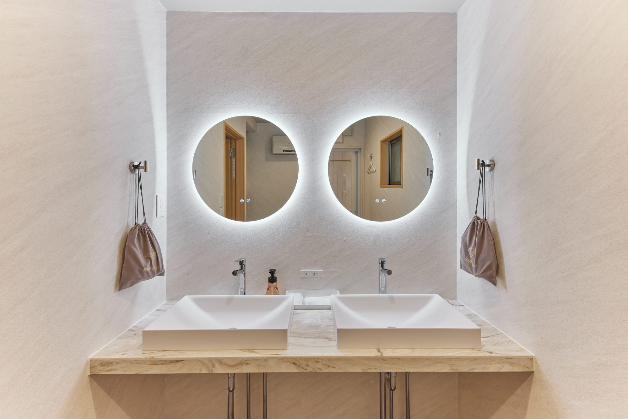 The bathroom features a double-bowl vanity, allowing multiple guests to get ready at the same time—perfect for busy mornings with family or groups. A washer and dryer are also provided, ensuring a comfortable and convenient stay even for longer visits, just like being at home.