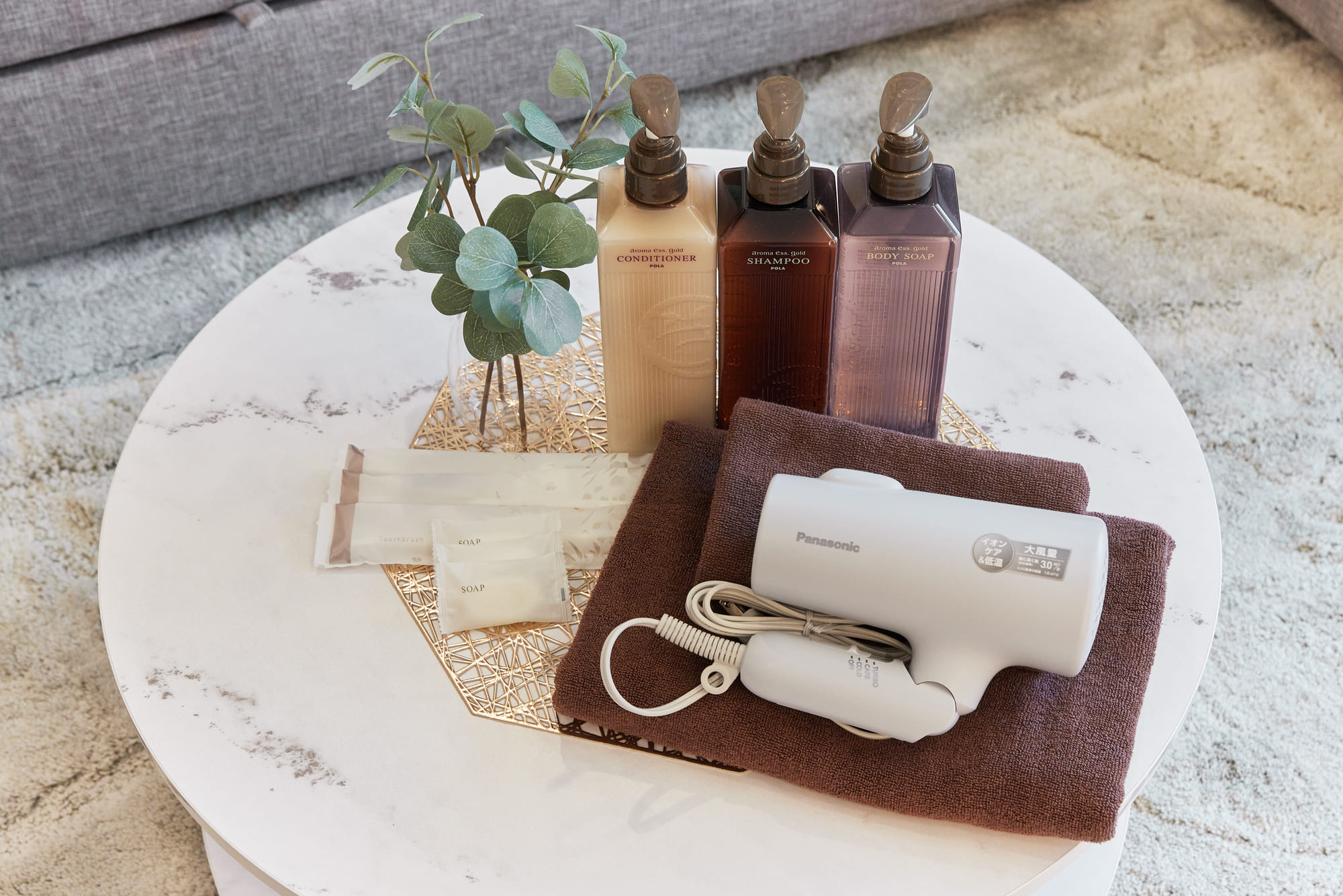 Bath towels, face towels, shampoo, conditioner, toothbrush, laundry detergent