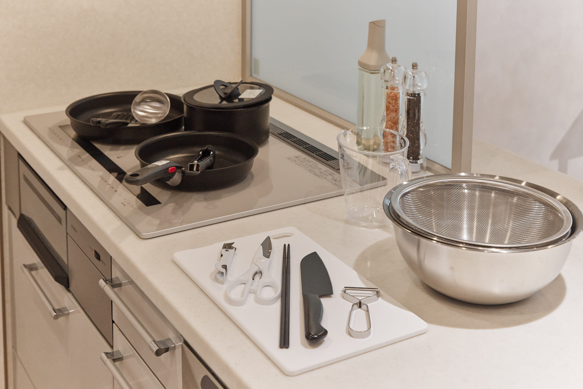 Cooking utensils: spatula, chopsticks, ladle, wine opener, kitchen knife, cutting board